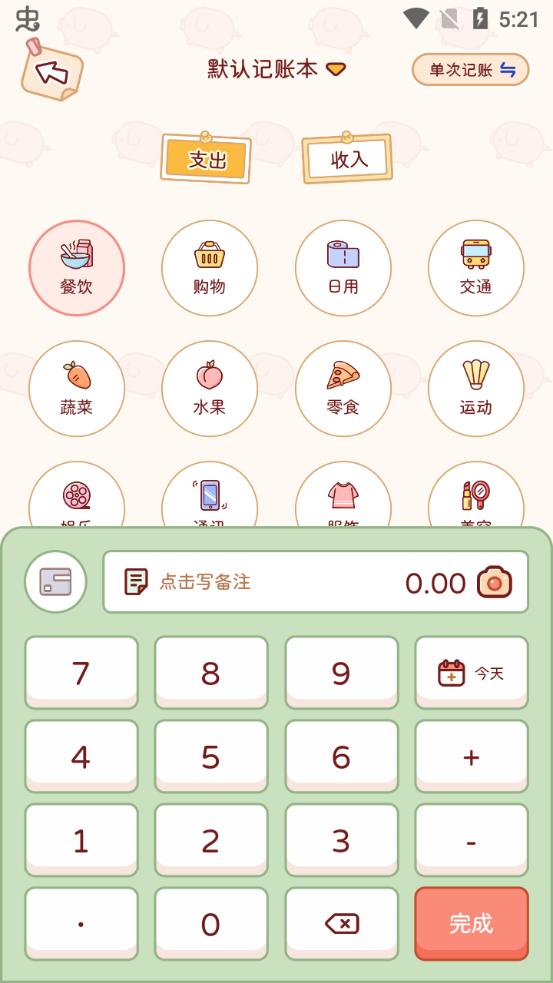 4、比如说餐饮,就可以输入相应的金额以及备注;填好之后点击右下角的完成即可;