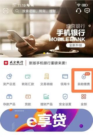 1、打开盛京银行app最新版,点击首页的【自助缴费】;