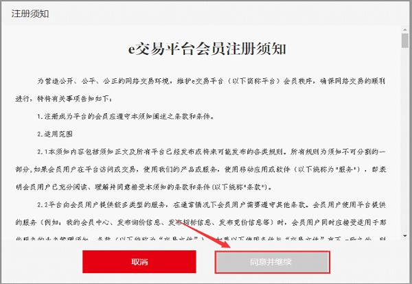 1、进入e交易网首页(www. ejy365.com),点击 “注册”,在弹出的《e交易平台会员注册须知》下方点击“同意并继续”,进入注册页面。