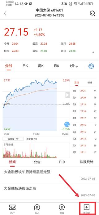 3、搜索后会自动进入该股票界面,点击右下角加自选