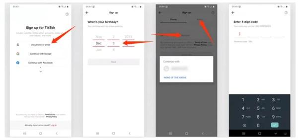 1.打开TikTok会弹出注册界面,显示可以通过手机号、邮箱、谷歌账号及其他第三方平台进行注册。推荐大家选择邮箱进行注册,不建议使用第三方平台进行注册。