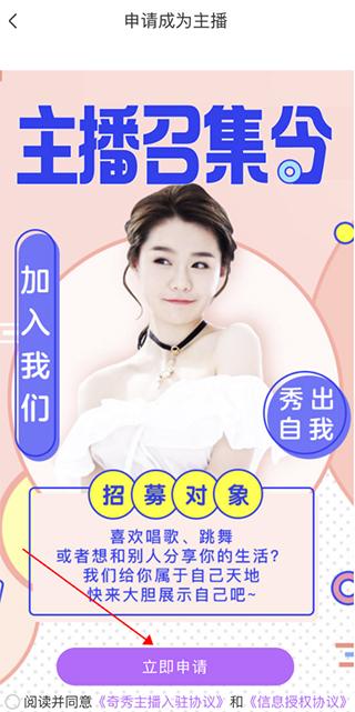 1、在首页点击右上角的紫色图标,点击主播入驻。