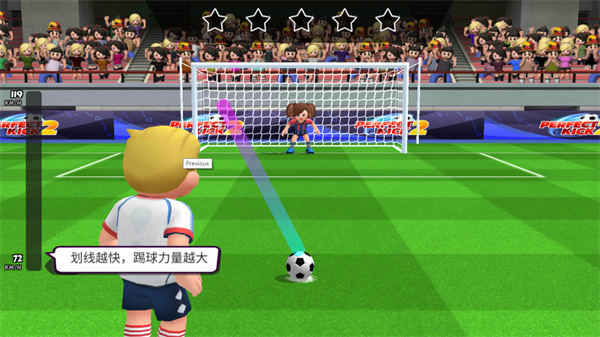 2、向球门滑动手指,球会被踢向划的方向,划线越快,球的速度就越快,左侧的速度表会体现出球速。