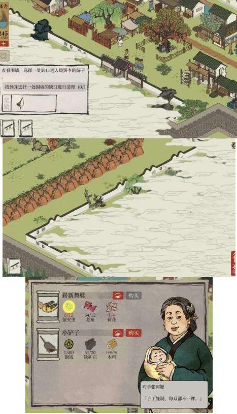 跟赵捕头进行对话;找到并选择一处围墙的缺口进行清理(草绳×10残荷×6刮刀×1);二选一,不推荐另一个(小铲子×1,刮刀×3,硝石×1,体力-300)