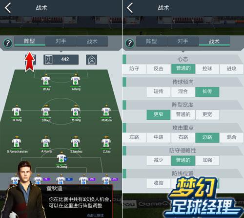 战术调整方面则可以针对球员心态、传球倾向、攻击重点、防守侵略性和防线位置等进行详细的设定,全面掌控球队的比赛 风格。