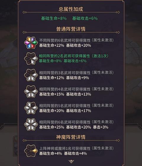 相同的阵营同时上阵可以组成阵营属性,性价比最高的是每个阵营选择1个武将,阵容成型快,适合过度;极限单阵营会导致材料武将不够而升星较慢,可在中后期逐渐转换阵营搭配。