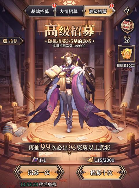 1、酒馆招募是获取武将最快的方式,使用招募令即可进行招募,有基础、友情、高级三大招募奖池。