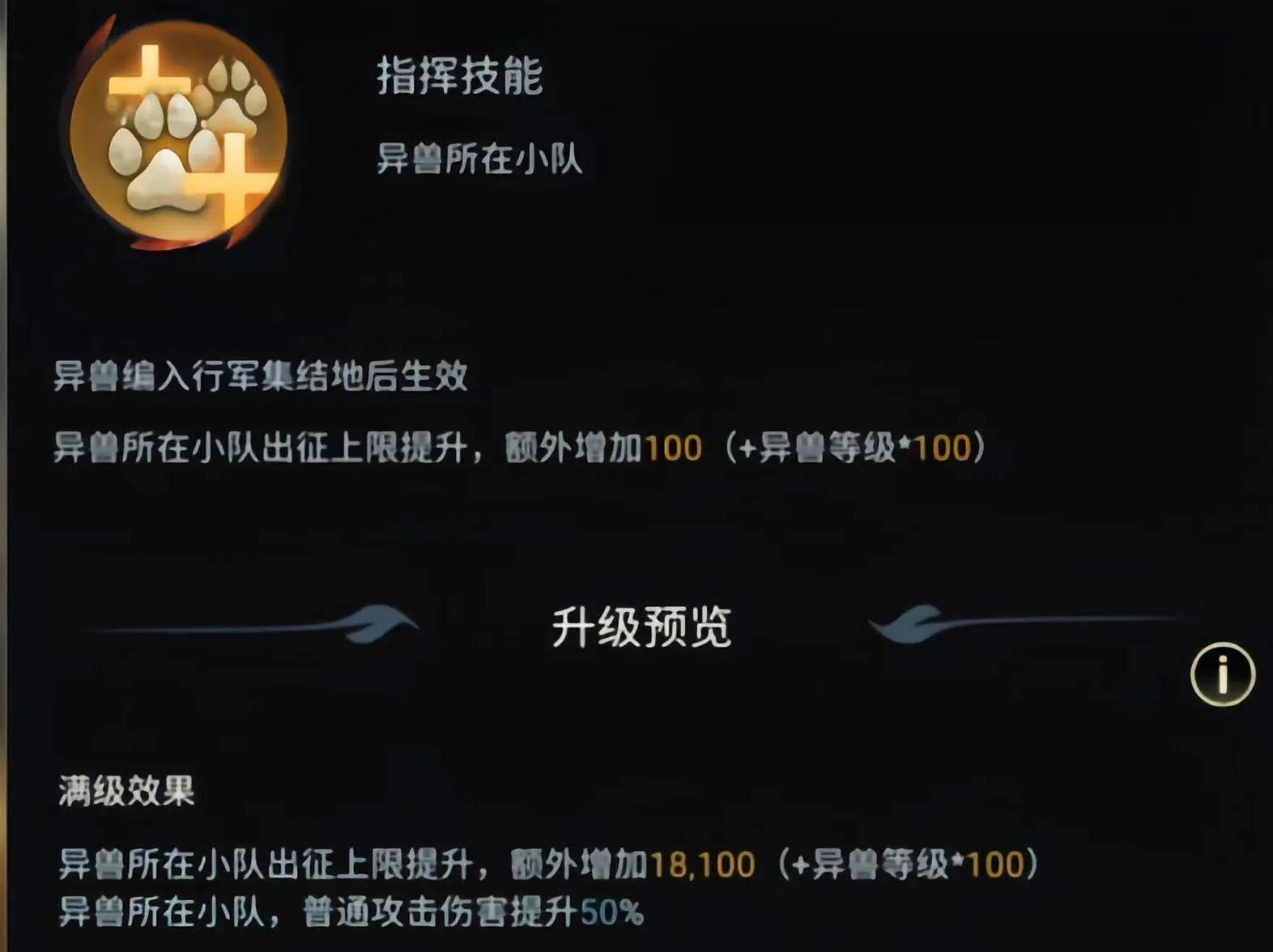 【1技能】可以增加该异兽所带领战斗小队的野兽数量,有效提升部队战斗力;