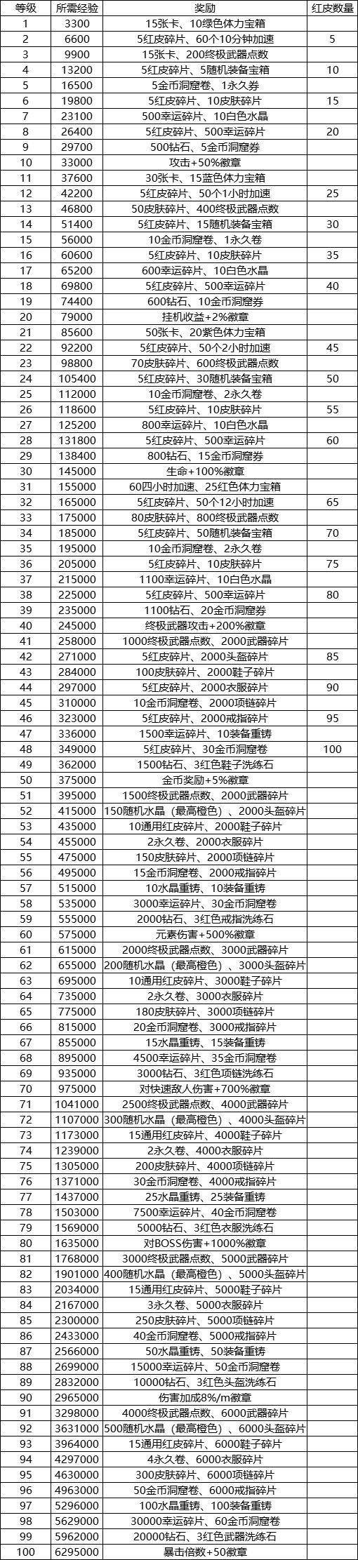 6.成长之路最高等级为100,具体奖励和经验如下,最高要充60多万,得到摇滚巨星红皮需要充3万5。
