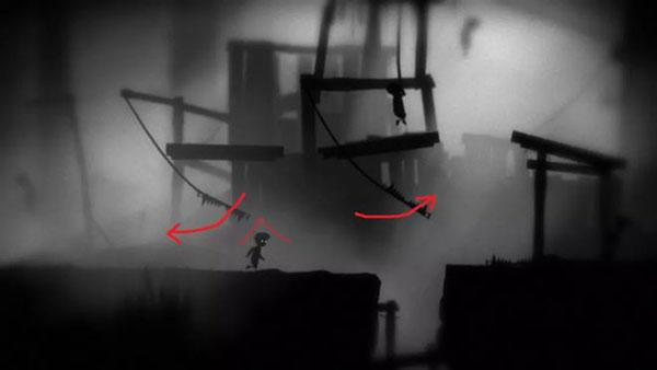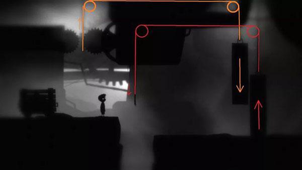 首先,左右绳索分别控制阻挡道路的左右障碍,玩家需跟随绳索下降以等待障碍完全开启,左上方的电锯就是为了限制玩家的下降,让玩家在左侧障碍开启完毕后迅速到下面来通过木箱再抓住穿过电锯的绳索,以防障碍关闭,最后抓住右绳索开启右边障碍,在左边障碍关闭之前升起右障碍以制造一个足以通过的间隙(玩家离开右绳索后两障碍同时下降)。本关卡需要玩家对时间掌控地恰到好处,利用时间差打开双门。