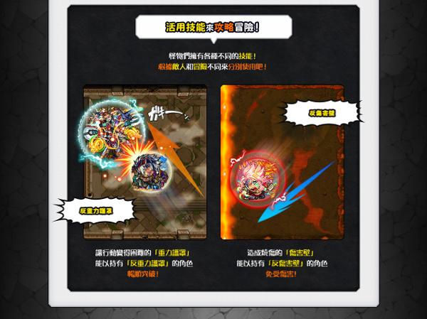 7、活用技能来攻略冒险,怪物们拥有各种不同的技能,根据敌人和冒险不同来分别使用吧。让行动变得困难的重力护罩会被持有反重力的角色畅顺突破,能造成烧伤的伤害壁会被持有反伤害壁的角色无视伤害。