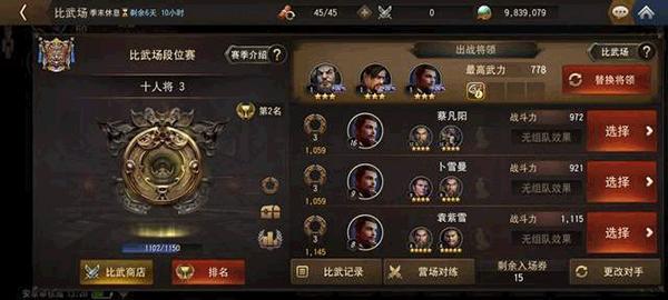7、比武场(必玩)——顾名思义,玩家们可以在这里进行PVP玩法证明自己,全程通过自动战斗的形式来决出胜负。其中有排位、专属商店以及比武PVP专区。玩家可以通过不断比拼,提高自己的排名,让更多的玩家看到自己。而在专用商店中,玩家可以凭借比武场比武获得的比武铸币兑换4星将领抽取券、特级兵书、武器强化材料等丰富奖励。