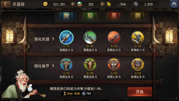 5、兵器库(针对性升级)——玩家持有的可以提升武将战斗力的建筑。玩家可以根据阵营,对武器和盔甲进行强化,优先级较高,对于前期战斗力提升有较大的作用。玩家可以根据自己的主要阵容,判断强化主次,对魏、蜀、吴、群四个阵容武将进行强化。武器强化可以提升对应国家武将的武力和智力,盔甲强化则是可以提升对应国家武将的生命力,而头盔强化则是可以提升对应国家武将的物防和魔防。