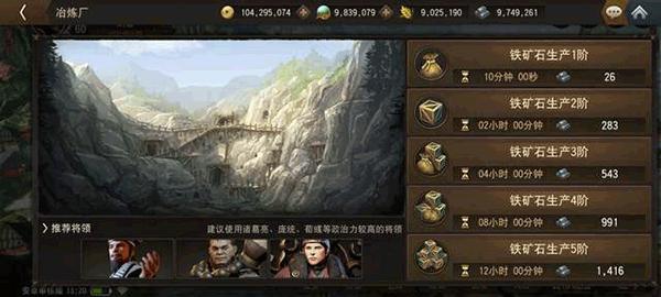 3、冶炼厂(每日派遣挂机必做)——铁矿石产出。玩家同样可以派遣不同的将领进行生产,不同将领会带来不同的影响。民意厅、主城中的建筑建造、以及主城-技能升级也需要消耗粮草和铁矿,同时兵器库强化也需要消耗铁矿。