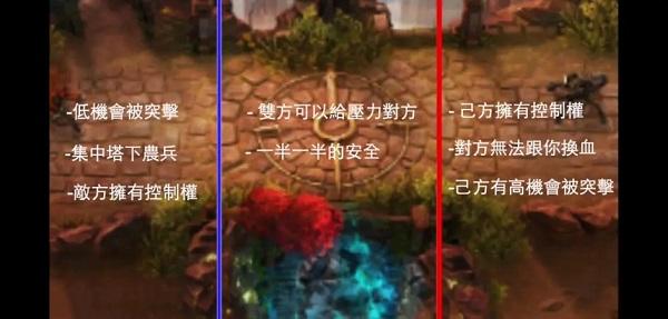 在这个图片,以左边为自己的塔来说的话呢,兵线控制到左边的时候, 自己会有比较低的机会被gank。