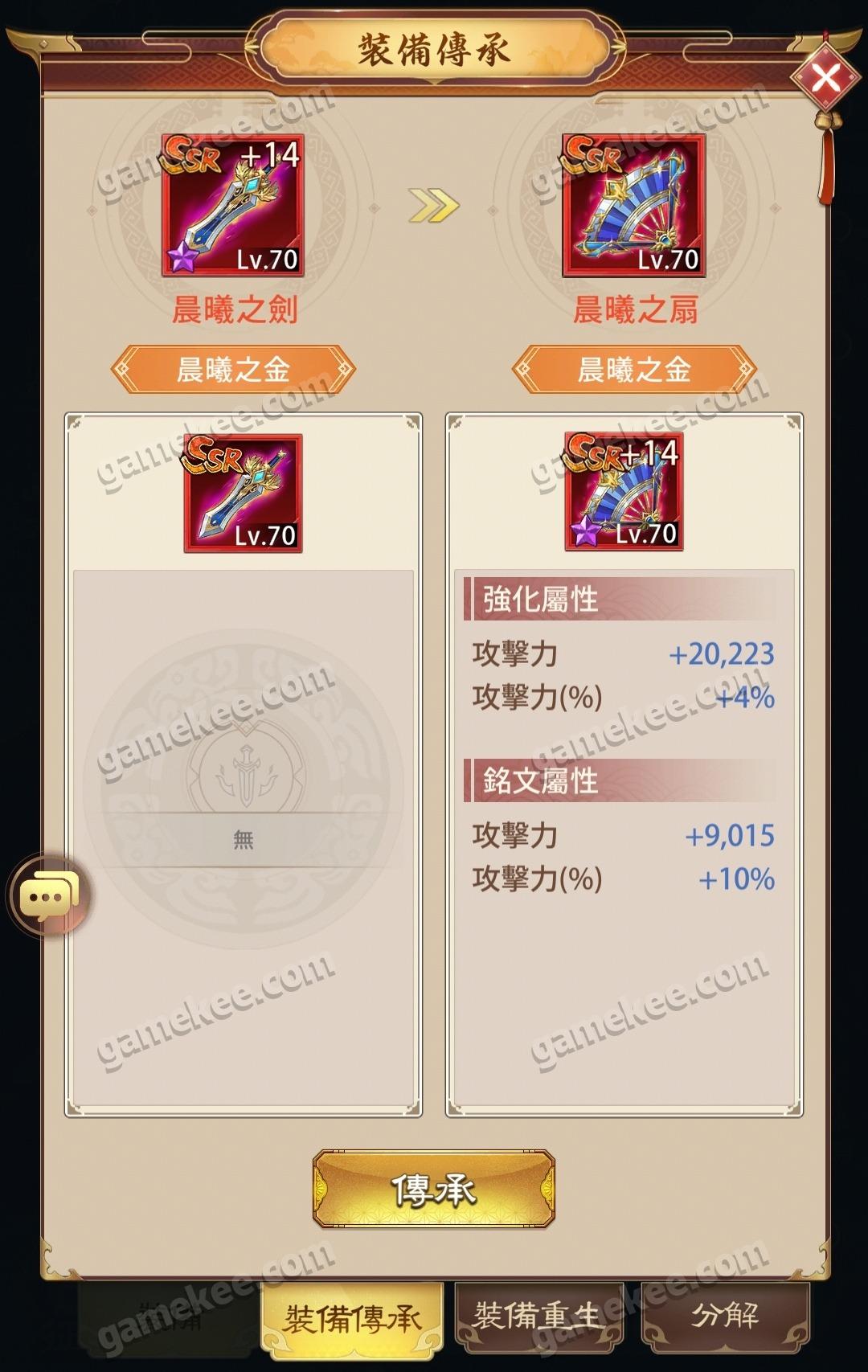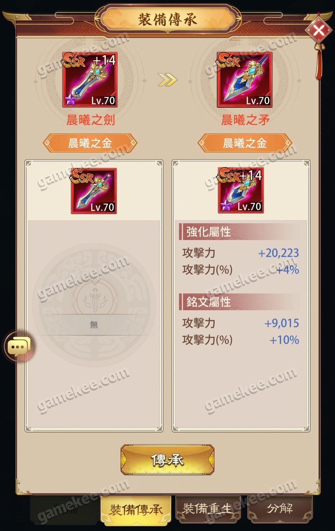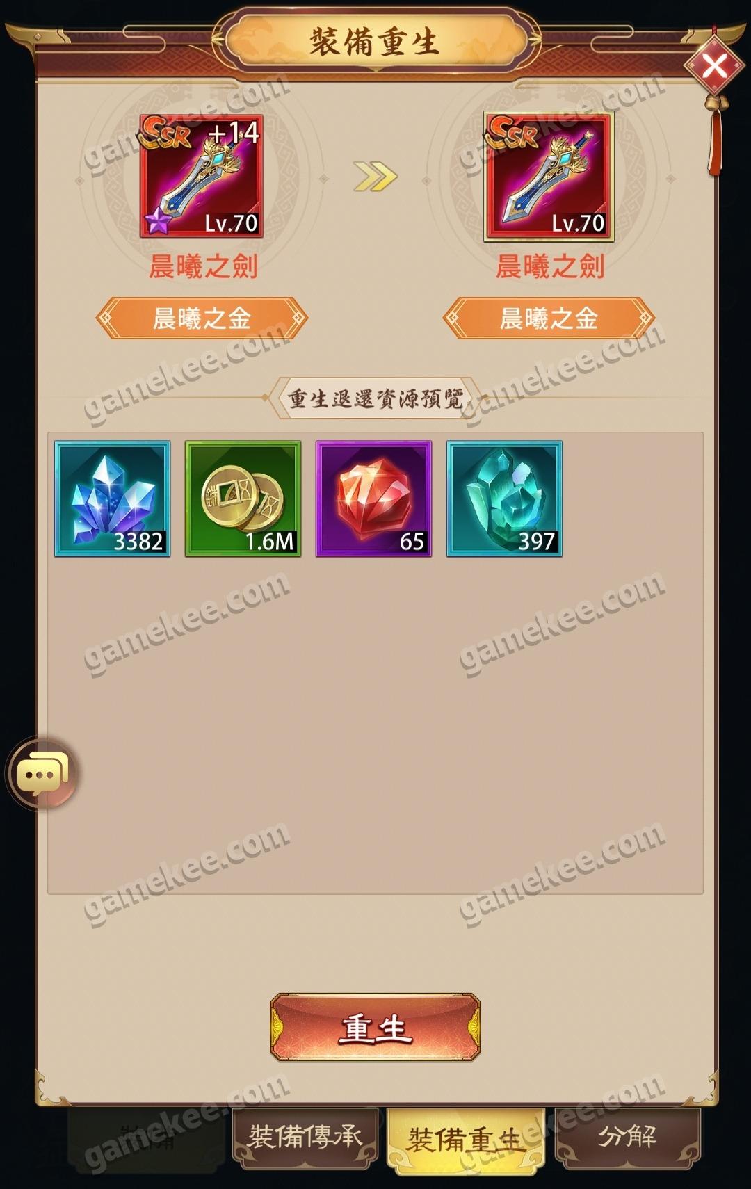 下图为装备重生(首先把装备卸载,在背包里点装备详情,点击传承后会出现装备重生页面[无法直接进入])