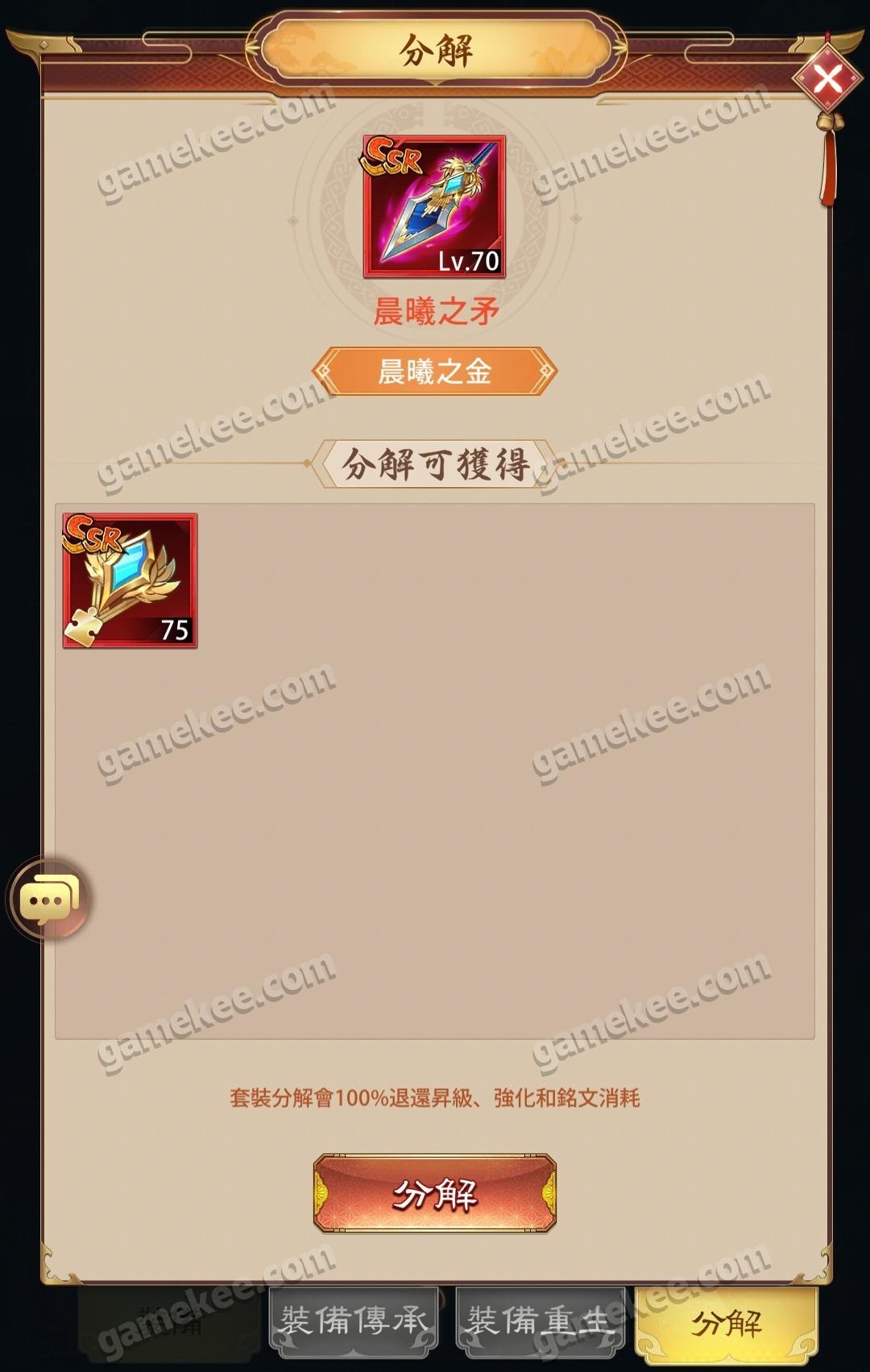 如下面两张图我们可以看到一件装备合成和分解的碎片是一样的,因此这就让我们无需担心前期给别的角色合成装备后,等抽到人权时因为碎片不够而无法提升战力。