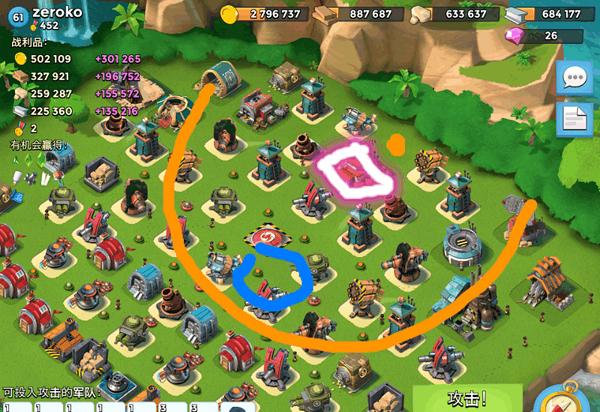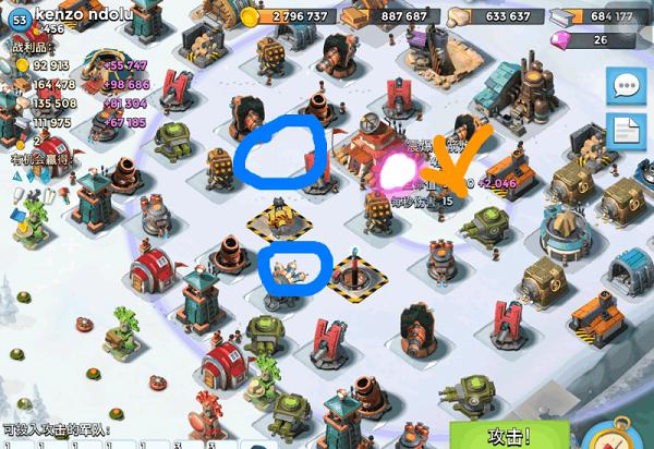 6、如此往返,当炮弹快落地时就将野人引导至大本另一侧,这样就可以将25级哈莫曼司令部拿下,不推荐其他兵种。(只有野人是移速快,伤害高,高机动的兵种)