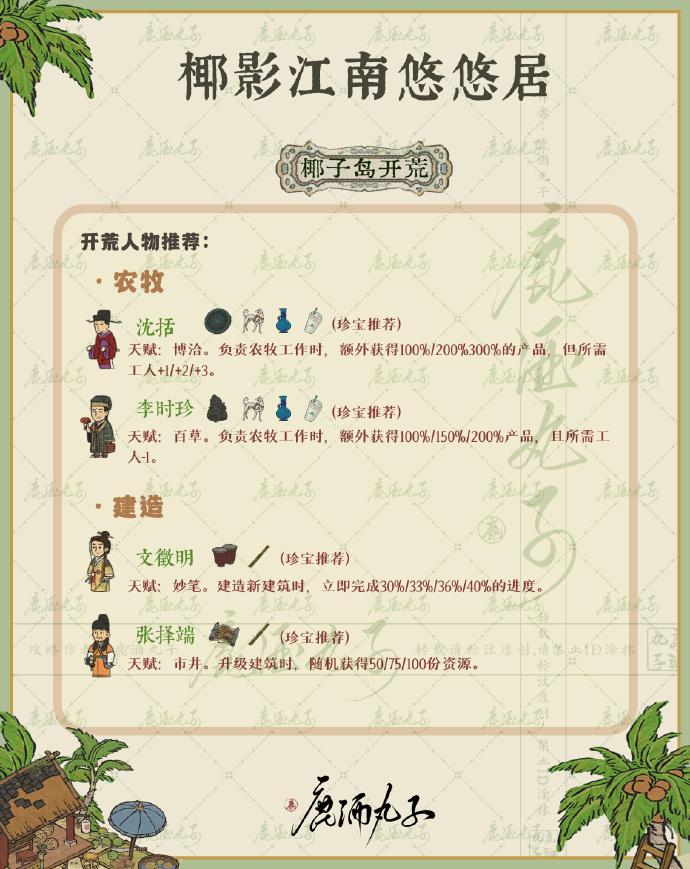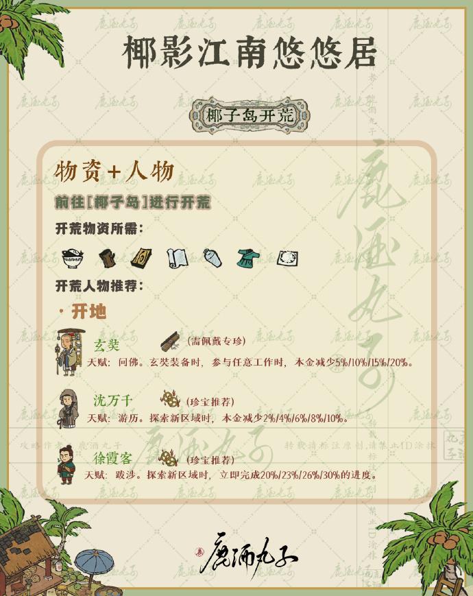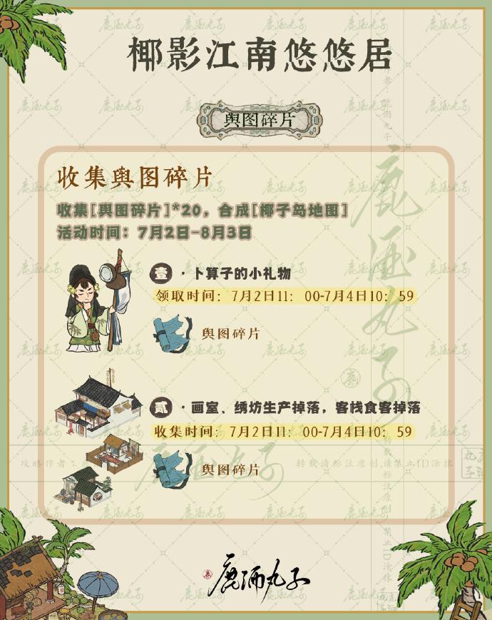 1.江南百景图椰子岛需要地图碎片20个,地图碎片获得方式是客栈提交订单,画室、绣坊生产随机掉落。