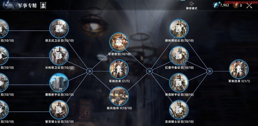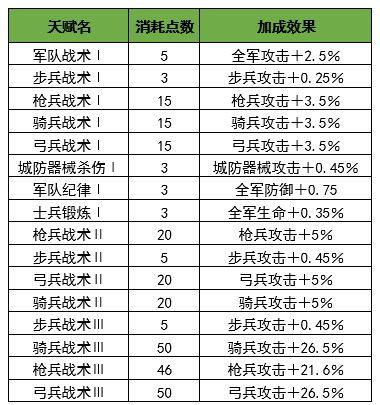主加弓兵骑兵与枪兵,其他天赋点到满足强制条件即可。由于就算到后面比例加成也是固定的,而且中间可能还会有不必要的天赋出现浪费点数,所以加到Ⅲ点满就行。