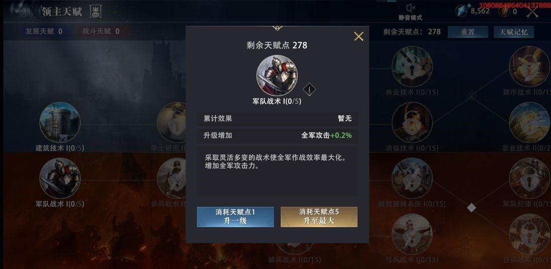 目前每位领主的最高等级皆为60级,共可获得278点天赋点数。而想要把所有天赋点满,没有几千点天赋点基本上是不可能的。所以个人建议前期所有天赋点在发展天赋上,等到领主等级和建筑等级足够高时花费100钻石重置天赋转到战斗天赋上。