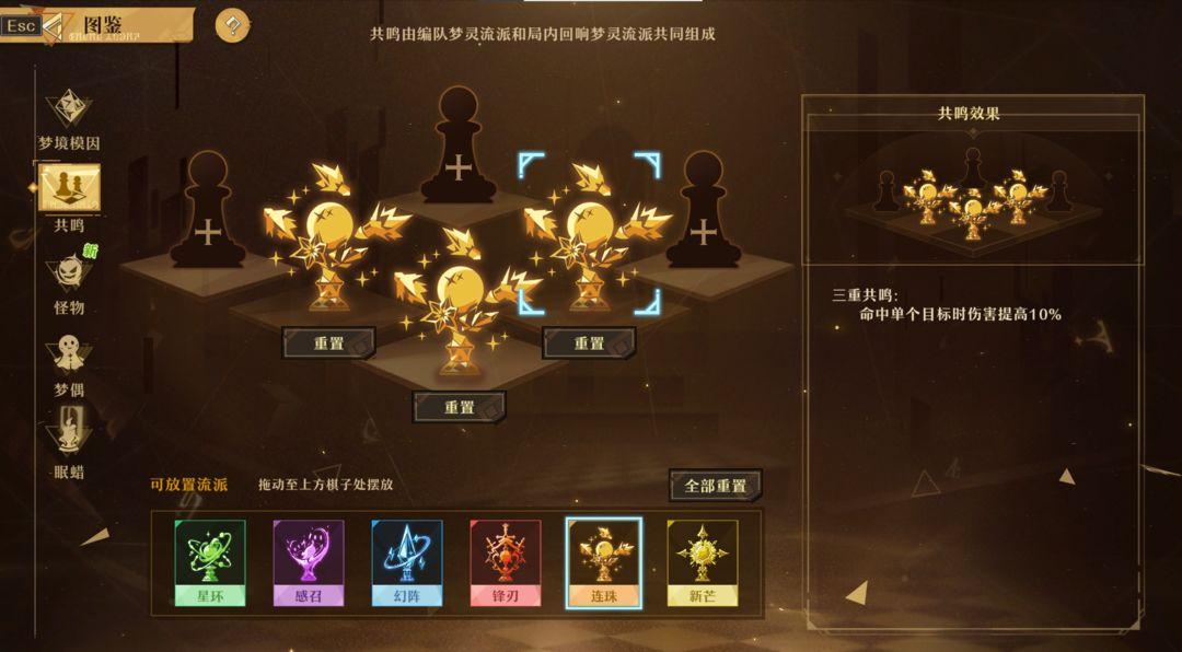 如图我们可以上阵3个角色,为队伍进入游戏锁定,生效三重共鸣:分别为三种流派各自的伤害提升