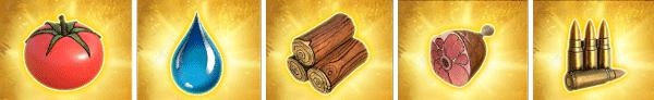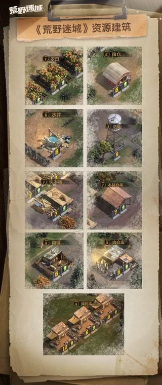 1、在希望镇的重建过程中,你将陆续修复【农田、水井、伐木场、肉铺、弹药库】这五种资源生产建筑,它们生产的资源类型分别为【食物、净水、木材、肉、子弹】。