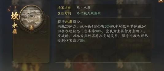 水攻配合当下大核张角主将技配合,闪电五连鞭提升20%几率震慑敌人。水覆对张角来说有伤害,且有几率提升震慑敌人的效果。(对于张角约等于包括雷霆的30%震慑!)