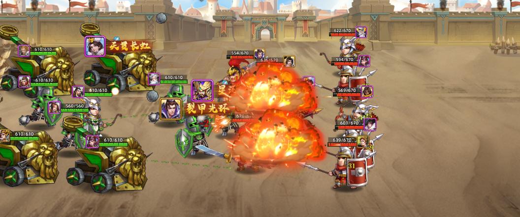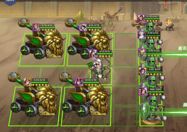攻城战斗正常阵型就是五个前排,甚至六个前排,后排输出有战车就可以,如果没有战车就选择射程远一些的弓或者弩。输出不要靠前排太近,以免被对方技能波及。
