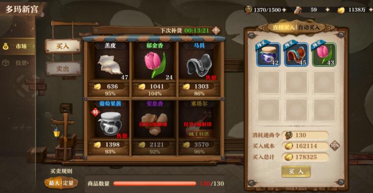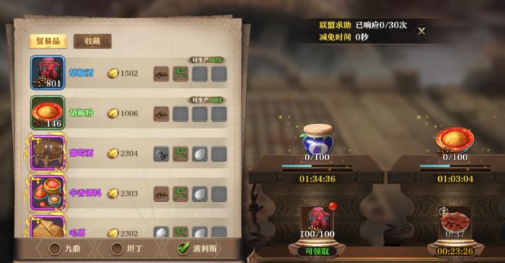 首先,通过跑商是最直接获取金币的方式。游戏前期,通过地域的贸易差赚取金币。直接影响跑商收益的因素,主要有下面2个方面:一是要对城池的贸易等级进行投资,前期最好在东、西两边的城池中选取一些特定的城池,将城池的贸易等级升级上去,以便可以买到更多的商品;二是要提升大学科技里面的:骆驼整备、通商惠工和经商之道这三个科技,其中骆驼整备关系到商品的装载量,通商惠工影响通商令的恢复速度,经商之道影响商品利益的暴击能力。