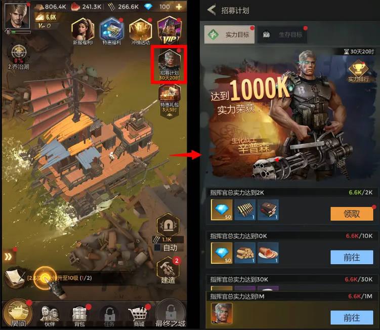 完成“招募计划”-“生存目标”指定每日任务获取活跃点,可得大量末日生存资源及钻石奖励。