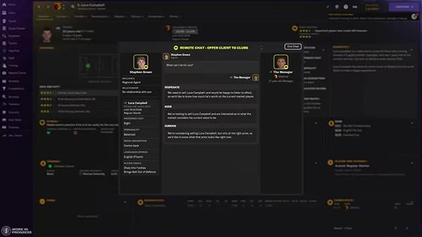选择该选项后,您能与球员的经纪人快速交流。您有三个回复选项,每个选项都有不同的语气。选择“渴望”表明您非常希望将球员出售,而选择“有意”则表示您有出售的兴趣,但只有在合适的价格下才会考虑。而选择“好奇”则表示您只是在试探手头上的选择。