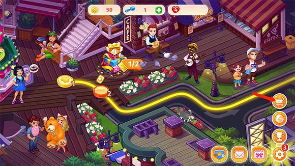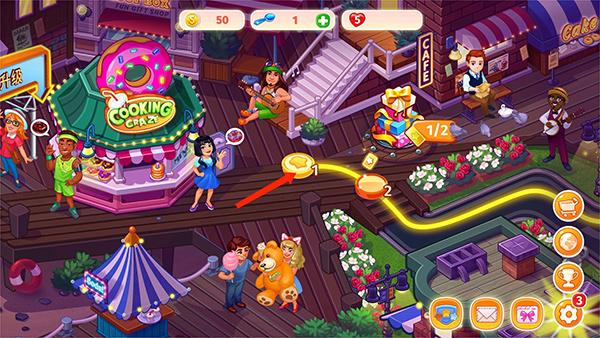 游戏玩法上说一下,其实主要是通过点击烹饪主食,再与配菜和饮料搭配上进行售卖,当然要根据顾客的需求进行搭配和美食供给。这一点上其实是一种很简单巧妙的设计,只需要在主食上进行烹饪,不需要对每个类型的食品都进行烹饪的重复操作,而是把操作内容转移到了对食物的搭配上,你需要配合对顾客的需求进行观察,从而合理的进行搭配,并且还可以在过程中进行连续的供给,达到快速连击的效果可以获取更高额的金币收益。整个游戏的食物制作界面其实是有分离式的设计,左侧进行主食的烹饪,中间部分为进行美食的搭配,右侧为饮料设备,在操作上的设计手感和体验上是非常好的,并且在顾客的需求上对图标和进度条也做了设计,直观且易于用户理解,整个服务制作的过程视觉接受和操作连贯性都很高。不过有一个地方可以优化一下,在我们点击配菜搭配的过程中,点击配菜,搭配到哪个主菜上的逻辑是固定的,例如当四个位置全部以正方形放置满主食时,单击配菜,会优先给最左下角的主食搭配上,在以逆时针的顺序类推下去;其实可以改成点击配菜有限给靠近这个配菜位置最近的主食给与搭配,这样可以减少点击操作的来回距离,可以很有效的提高用户的操作体验,这并不是减低难度的问题而是操作的连贯性,和操作常规习惯,即配即给,无论是单手操作还是双手操作都可以明显提升操作爽感。