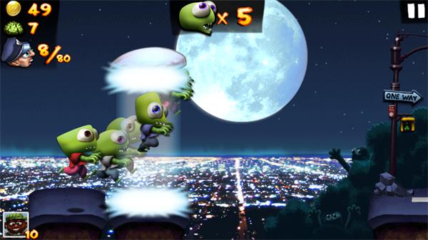 在僵尸尖叫中,玩家不需要控制僵尸的左右移动,玩家可以点击屏幕,让僵尸跳起来,当玩家单击一下则僵尸会跳跃起来,当用户长按屏幕,僵尸便会在跳跃到一定高度后,以一种滑行的姿态在空中滑翔一段路程