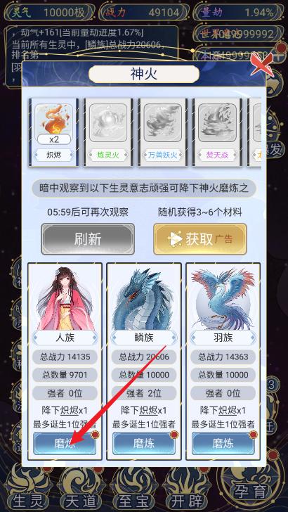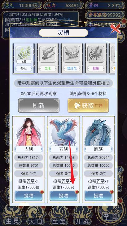 越玩越无聊,太简单了,不看广告也能过。前期先把战力最高的分配给转化灵元,把灵根点满,点满之后再把战力最高的几个分配给根源,功德没什么用,用战力最差的挂着就行。然后根源别乱用,只点战力最强的那个的道场。。然后一些选择也主打那个最强的族群。我选的是魔族。天象先点升级那个,后面再把战力那个点了。基本上量劫就稳了。点满一个族群,然后下一个族群重复。。然后不知道是不是BUG,灵根是可以移植的,把所有灵根移植到你最强的那个族群,点满之后就在移植到你要点的下个族群。可以白嫖好多战力。就这么简单。。