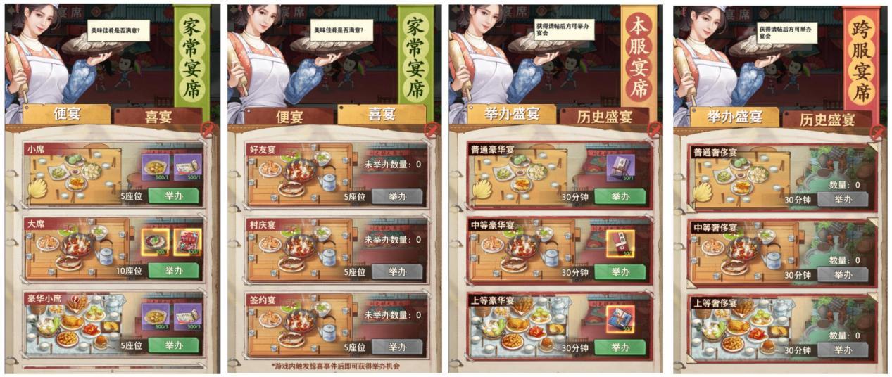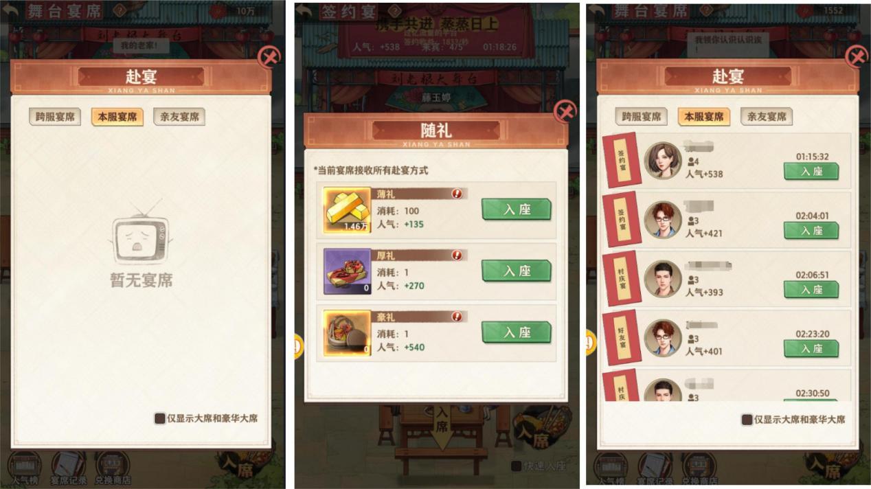 1、举办宴席有3种形式:「我的宴席」、「本服宴席」、「跨服宴席」,玩家可以通过举办宴席获取积分与人气