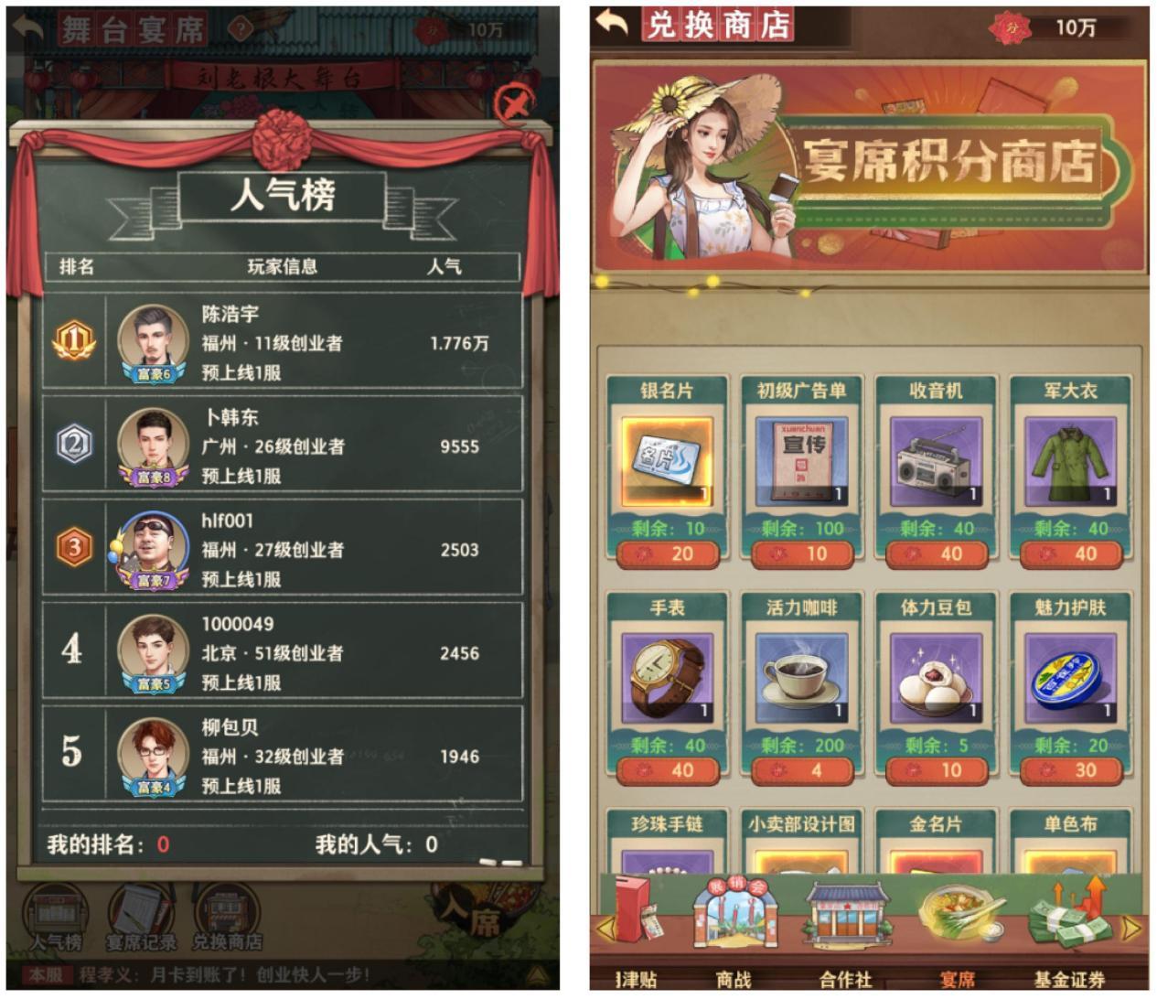 2、我的宴席通过消耗指定道具可以宴请同服5或10座玩家入席,喜宴需要指定条件激活才会触发且3天内需举办过期失效,举办玩家可以获得所有入席玩家积分与人气之和