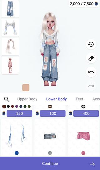 3、选择对应的服饰,有的支持多种颜色,可以变色,人物右侧有上一步和下一步,橡皮可以撤销角色身上的一切装扮。