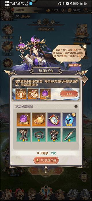 6、快速作战可以获得120分钟挂机收益,每天免费一次领取,使用元宝可以额外再作战3次。如果激活快速作战特权,每天可以免费3次,使用元宝可以额外再作战8次。小编建议非RMB玩家还是不要买这个快速作战特权,每天坚持挂机就可以了。