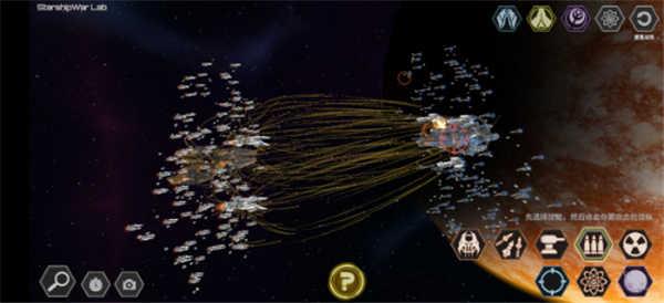 6、上面右边五个依次为:操控蓝方战舰、操控黄方战舰、操控水滴、选择战舰数量及自动开火密度、重置战场。