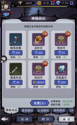1、【必买】火柴商行里的神秘商店每天都有好几次免费刷新,看到可用金币购买的进阶石、幸运卷、伙伴经验就买它买它买它!6折钻石的高能晶石也是很划算的哦!
