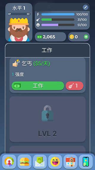 2、我们要通过赚钱来提供自己更好的生活,养活自己;直接点击屏幕下方“工作”的条目即可获得金钱,不过在金钱数量增加的同时,体力值、心情值、饥饿值都会有较快的下降;