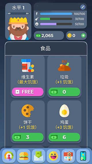 我们要通过赚钱来提供自己更好的生活,养活自己。直接点击屏幕下方“赚钱”的条目即可获得金钱,不过在金钱数量增加的同时,体力值、心情值、饥饿值都会有较快的下降。