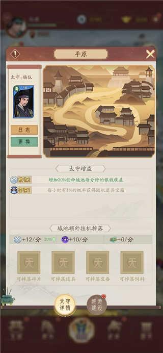 这里是各种资源的主要产出来源,给通过的城池任命太守后,就能解锁额外的城池掉落奖励。(挂机时间有上限,记得及时领取哦)