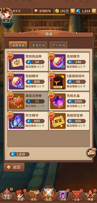 除了开始的第一次钻石十连之外,精灵商店性价比比较高的商品,500钻的先知水晶(低概率),300钻的10探宝券,20000金币的探宝券,10000金币的竞技场挑战券都是不错的商品。