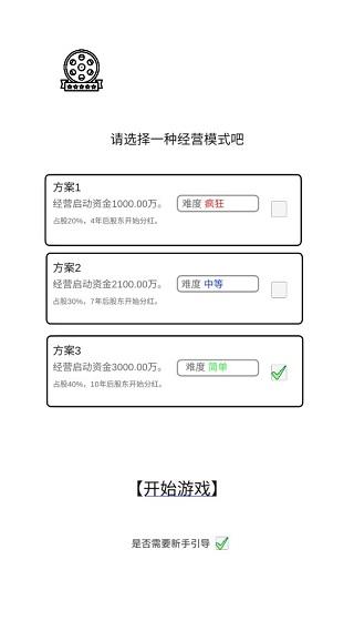1、进入游戏,选择存档,之后选择一种经营模式,如方案1:经营启动资金1000.00万,占股20%,4年后股东开始分红;方案2:经营启动资金2100.00万,占股30%,7年后股东开始分红;方案3…,不同的选择方案对应的难度不同,如果是新人导演,建议从最简单的方案3开始做起!