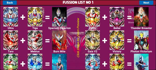 3、点击右上角fussion list可以查看欧布奥特曼不同形态的合成方式;