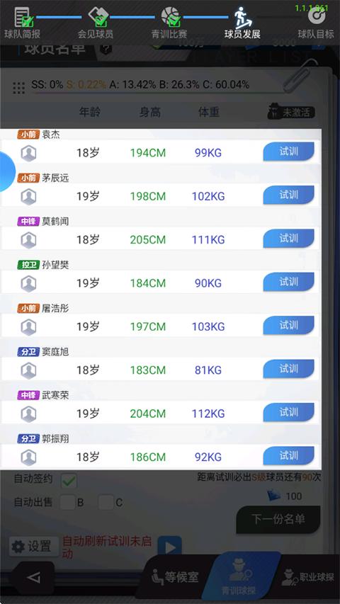 2、球员分为S/A/B/C四类,品级越高潜力就越高,能达到的上限也更高,年龄亦是如此。每一次球探有8个待试训苗子,一次只能在其中试训一个。球员名单首次刷新免费,后面每次100钻石,试训一个球员150钻石(开通高级顾问,每次费用可享受最高8.5折)。