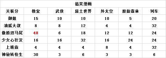 前三分别是:傲娇双马尾+教室=48分;少女心壮汉+废土世界=32分、油腻大叔+列车=32分、上班族+列车=32分;神秘转校生+教室=30分。