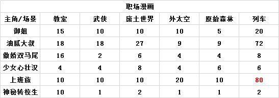 前三分别是:上班族+列车=48分;神秘转校生+教室=30分;傲娇双马尾+教室=16分、油腻大叔+列车=16分。